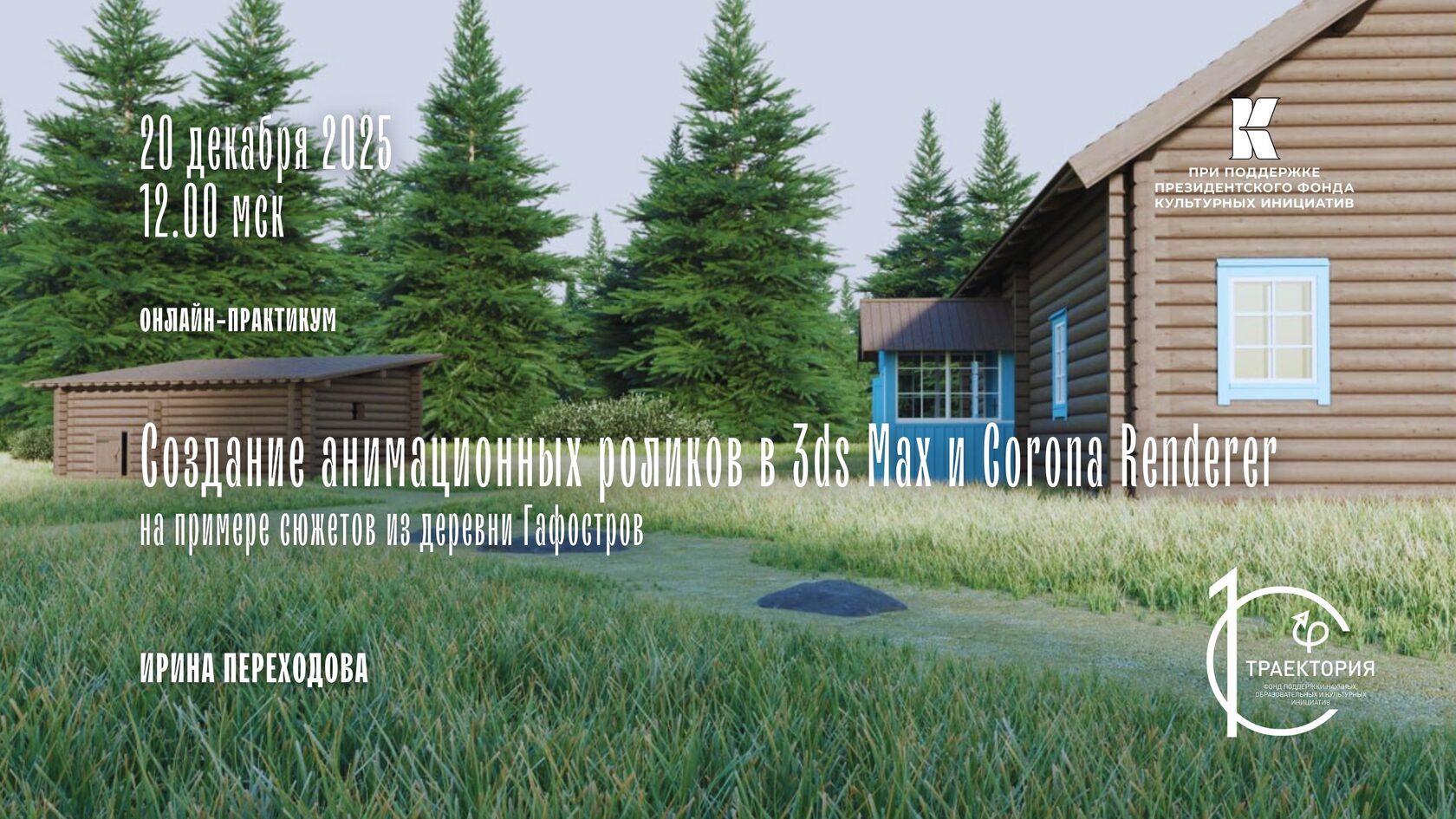 В рамках заключительного мастер-класса будет разобран алгоритм создания анимационных роликов в 3ds Max и Corona Renderer. Для просчета анимации мы выберем наиболее наглядные сюжеты и траектории движения, раскрывающие архитектурные особенности исторических построек деревни Гафостров, характер их размещения в ландшафте, а также изменения в природном окружении с течением времени.
