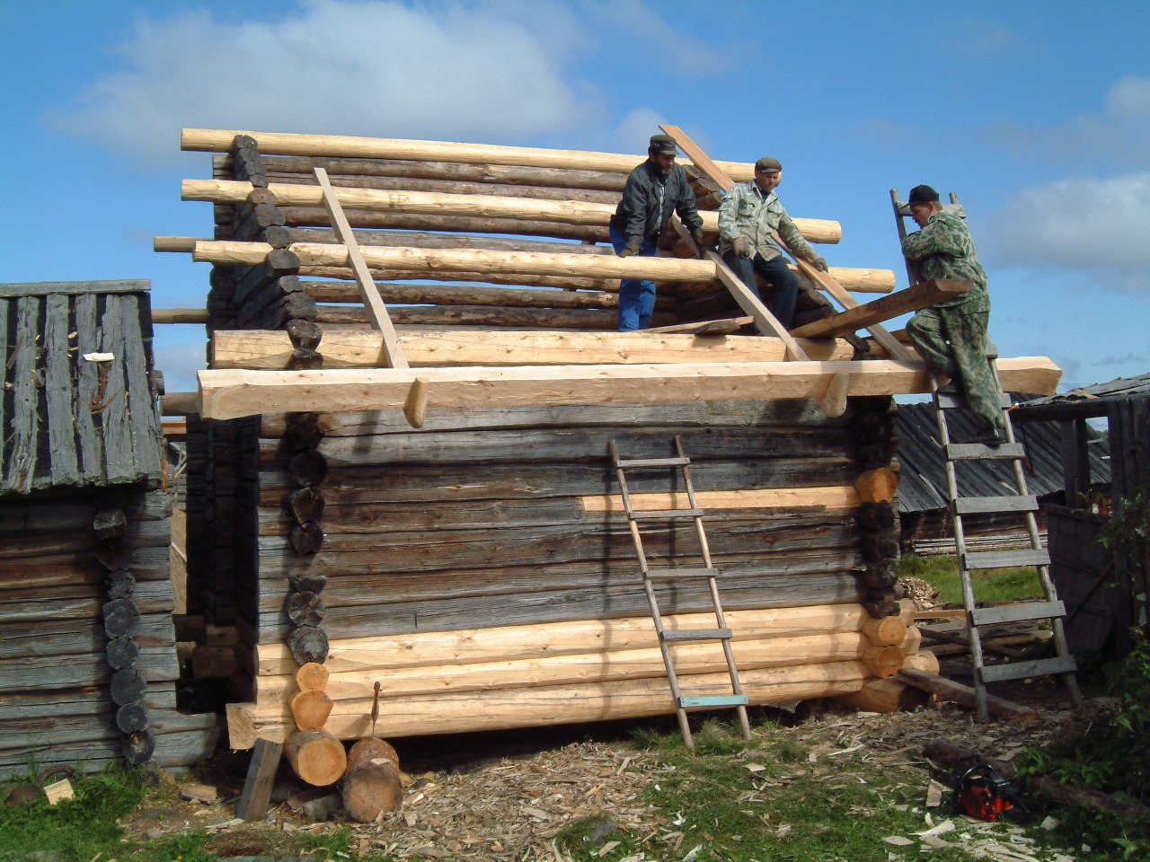 Иллюстрация к новости: Работы по воссозданию амбара Поттоевых в деревне Гафостров в 2019 году. Фото: © Константин Петров.