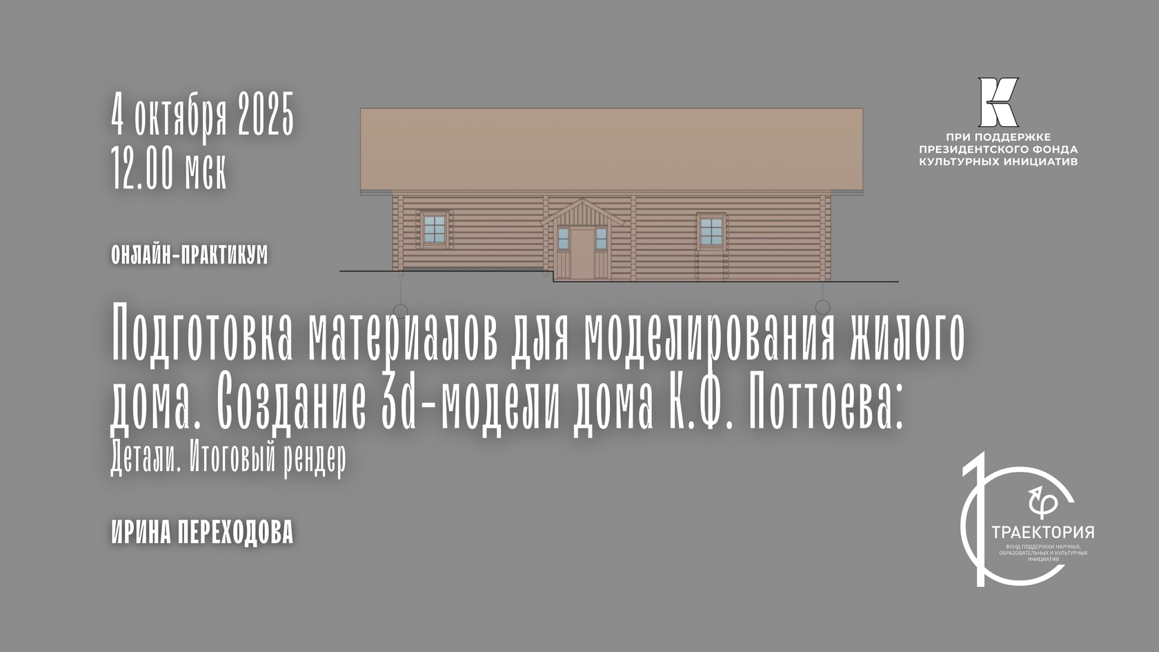 На мастер-классе мы проведем анализ обмерных чертежей дома Виктора Поттоева, обсудим алгоритм и создадим основные элементы жилой постройки в 3ds Max. Таким образом, мы отработаем навыки текстурирования, полученные при моделировании риг, на более крупном сооружении из бревен.